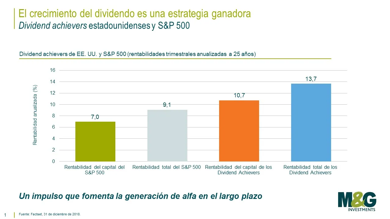 En cambio, nosotros nos concentramos en el crecimiento del dividendo debido a su influencia favorable en dos frentes diferenciados: el efecto positivo en la disciplina de capital de una empresa y el impulso que proporciona a las cotizaciones de estas compañías. Creemos que la combinación de estas ventajas convierte a la inversión en dividendos crecientes en una estrategia ganadora para inversores con horizontes a largo plazo.