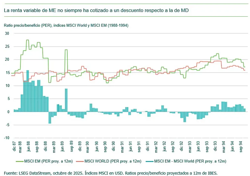Esta lente es especialmente relevante al comparar mercados emergentes (ME) y desarrollados (MD). La narrativa predominante asume que los activos de ME son por naturaleza más arriesgados y deberían cotizar siempre a un descuento frente a los de MD. Sin embargo, los fundamentales no siempre confirman lo anterior, y la historia revela excepciones: la renta variable de ME cotizó en valoraciones más elevadas que sus homólogas de MD durante parte de los ochenta y los noventa.