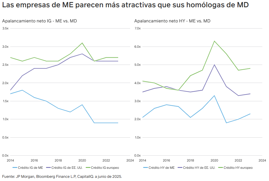 Además de un panorama soberano más positivo para los ME, la calidad crediticia de su sector empresarial también ha mejorado de manera palpable. Las compañías de estos países muestran cifras de endeudamiento más favorables, con menores niveles de apalancamiento neto (financiación) y mejores ratios de cobertura de intereses.