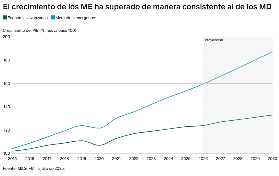 Un crecimiento económico sólido ha sido y sigue siendo uno de los principales atractivos de la inversión en ME, al aportar un fuerte motor de crecimiento del beneficio de las empresas. En las últimas décadas, las economías emergentes y en vías de desarrollo han crecido a mayor ritmo que sus homólogas desarrolladas, y es probable que esta tendencia continúe; se prevé que las de ME crecerán algo por encima del 4 % entre 2025 y 2026, frente a un mero 1,5 % de las de MD1.