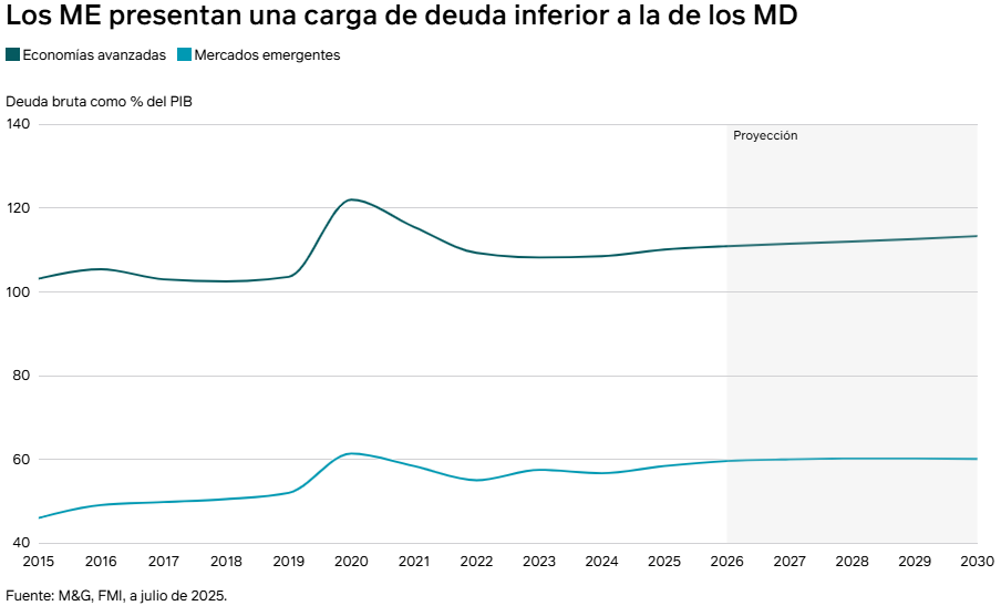 Los bancos centrales del universo emergente no son los únicos en haber dado la vuelta a la situación. Los gobiernos de estos países comienzan a caracterizarse por su estabilidad y por la implementación de políticas fiscales prudentes, en un momento en que los MD se ven cada vez más acosados por problemas presupuestarios. El ratio de deuda/PIB medio en las economías emergentes y de renta media es del 73 %, considerablemente inferior al 110 % de las avanzadas7. Unos niveles de endeudamiento estables crean un colchón que permite absorber conmociones globales, y los ME parecen cada vez más resilientes.