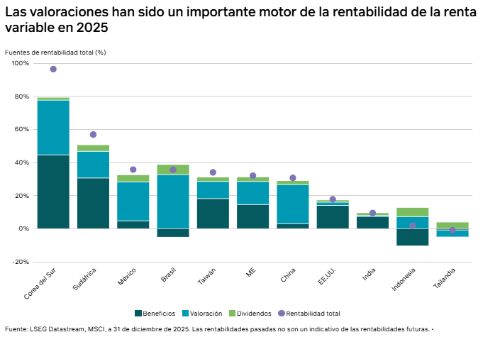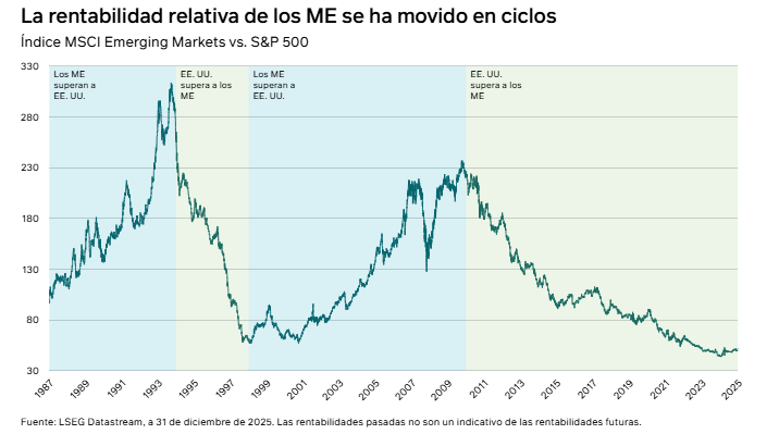 2025 ha sido un año excelente para la renta variable de mercados emergentes (ME), que ha registrado su mejor rentabilidad anual desde 2017, unos 10 puntos porcentuales superior a la de los mercados desarrollados (MD). En un entorno de turbulencias geopolíticas y económicas, este resultado superior demuestra que los inversores comienzan a darse cuenta de la mejora fundamental y de la resiliencia inherente de la clase de activos. Tras verse ignorados durante varios años, los ME suscitan un interés creciente, sobre todo ahora que el excepcionalismo estadounidense se ha puesto en duda.