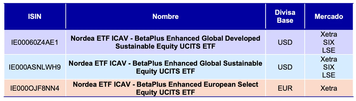 1 Fuente: Bloomberg. Fecha: 25.11.2025. La lista de ETF de renta variable activa sostenible en Europa incluye aquellos ETF que cumplen con las directrices de la ESMA sobre el uso de los términos «sostenible» y/o «ESG» en los nombres de sus productos. Nordea Asset Management (NAM) ha determinado que los ETF sostenibles de NAM cumplen los requisitos establecidos en las Directrices de la ESMA sobre los nombres de los fondos que utilizan términos relacionados con ESG o la sostenibilidad (las «directrices»). Según las directrices, los fondos que utilicen términos relacionados con la sostenibilidad deben tener el 80 % de sus inversiones en valores que cumplan características medioambientales o sociales claras u objetivos de inversión sostenible. También deben excluir las inversiones en empresas que no se ajusten a los índices de referencia alineados con el Acuerdo de París de la UE, como todos los productores de petróleo y gas. 2 El rendimiento pasado no es un indicador confiable de resultados futuros y es posible que los inversores no recuperen el importe total invertido. El valor de su inversión puede subir y bajar, y usted podría perder parte o la totalidad del dinero invertido. 3 Las principales exclusiones del índice de referencia alineado con los Acuerdos de París incluyen las armas controvertidas, el tabaco, las violaciones de los principios del Pacto Mundial de las Naciones Unidas o las directrices de la OCDE y las actividades relacionadas con los combustibles fósiles. 4 El índice de referencia del ETF Nordea ICAV – BetaPlus Enhanced Global Developed Sustainable Equity Fund UCITS es el índice MSCI World; el índice de referencia del ETF Nordea ICAV – BetaPlus Enhanced Global Sustainable Equity Fund UCITS es el índice MSCI All Country World.