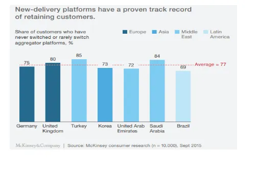 El envío de comida constituye un buen ejemplo sobre cómo esta nueva economía está provocando una disrupción en las cadenas de valor tradicionales. Los clientes de las nuevas plataformas online de envío de comida a domicilio tienen distintas necesidades y expectativas que las del cliente tradicional de las pizzerías. El tiempo es un factor fundamental: la velocidad de entrega es la variable de mayor relevancia en la satisfacción del cliente, y una media del 60% de los consumidores de todos los mercados la mencionan como un parámetro clave. La gran mayoría de los pedidos se realizan desde el hogar de los clientes (82%) y durante el fin de semana (74%), por lo que el trabajo por turnos es el statu quo de los repartidores. Las plataformas de envío permiten la personalización de la experiencia de pedir comida, dado que almacenan datos relevantes proporcionados por los clientes, generando así una gran fidelidad. Una vez que los usuarios se registran, el 80% de ellos nunca o rara vez cambia de plataforma, lo que genera una sólida dinámica en la que aquella empresa que logre un mayor número de clientes en el menor tiempo posible, se impone al resto.