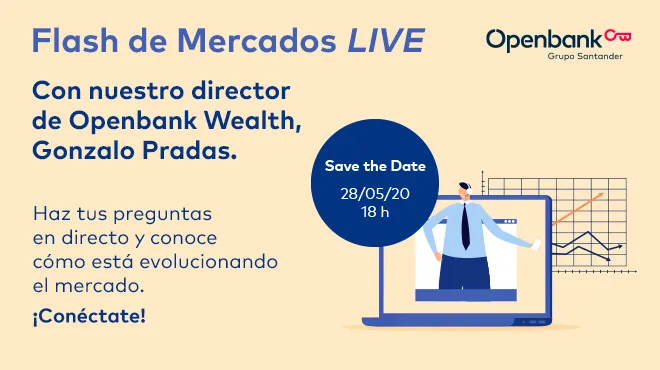 Esta tarde podrás seguir en directo a partir de las 18:00 horas un nuevo Flash de Mercados Live. Durante el Webinar, Gonzalo Pradas, director de Openbank Wealth hablará sobre la evolución de los mercados, la estrategia actual y cómo estamos posicionando las carteras desde Openbank ante la amenaza del Covid-19.