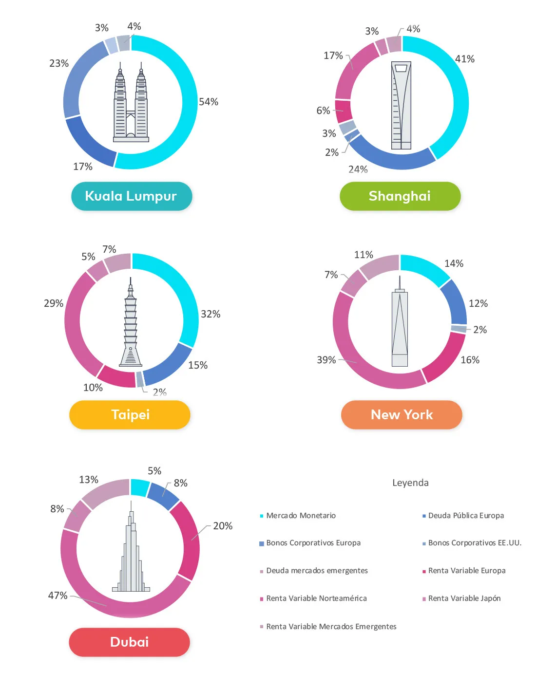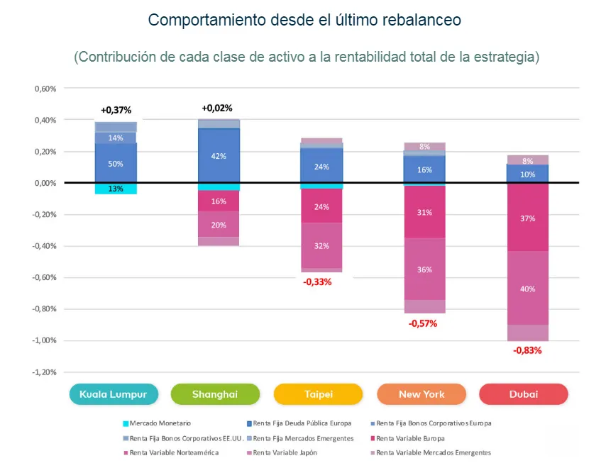 En base a ello, hemos decidido incrementar un 1,3% el peso en renta variable norteamericana y mercado monetario, reduciéndolo en renta variable japonesa (en todas las carteras excepto en Kuala Lumpur):