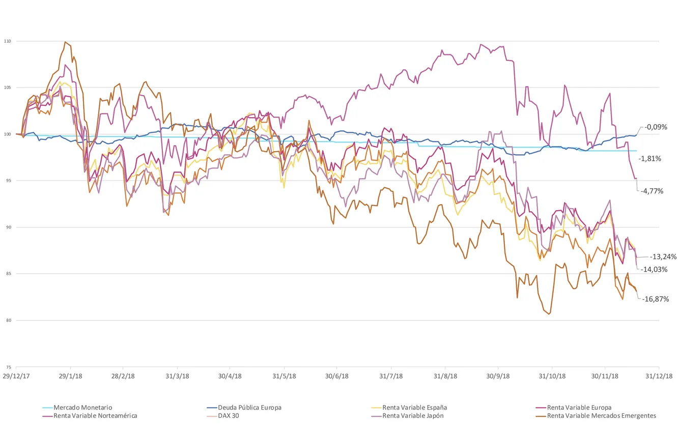 Fuente:Thomson Reuters. Este gráfico hace referencia a la evolución de los principales índices de las diferentes clases de activos desde inicio de año (29/12/2017 = base 100) hasta el 18/12/2018. Las rentabilidades pas1as no son un indicador fiable de resultados futuros. Mercado Monetario se representa utilizando iShares eb.rexx ® Money Market (DE) ETF EUR. Deuda Pública Europea se representa utilizando iShares Core € Govt Bond UCITS ETF EUR (Dist). Renta Variable España se representa utilizando el índice Ibex 35. Renta Variable Europa se representa utilizando el índice Eurostoxx 50. Renta Variable Norteamérica se representa utilizando el índice S&P 500. Renta Variable Japón se representa utilizando el índice Topix. Renta Variable Mercados Emergentes se representa utilizando el índice MSCI EM. iShares® y BlackRock® son marcas registradas de BlackRock Inc y sus filiales ("BlackRock") cuyo uso se realiza bajo licencia. BlackRock no garantiza que las inversiones en los productos o servicios ofrecidos por Openbank sean adecuados para los clientes de Openbank y no se responsabiliza de las operaciones, comercialización o venta de los productos o servicios ofrecidos por Openbank, ni BlackRock asume ninguna responsabilidad derivada de los servicios que presta al Comité de Inversiones con los clientes de Openbank.