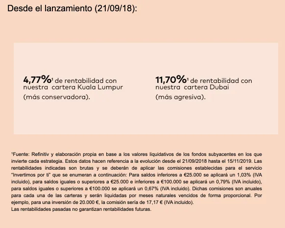 *Promoción válida para clientes que no hayan contratado el servicio “Invertimos por ti” a día 15 de octubre de 2019. Las comisiones establecidas con carácter mensual para el servicio “Invertimos por ti” son las que se enumeran a continuación: Para saldos inferiores a €25.000 se aplicará un 1,03% (IVA incluido), para saldos iguales o superiores a €25.000 e inferiores a €100.000 se aplicará un 0,79% (IVA incluido), para saldos iguales o superiores a €100.000 se aplicará un 0,67% (IVA incluido). Dichas comisiones son anuales para cada una de las carteras y serán liquidadas por meses naturales vencidos de forma proporcional. Consulta aquí las condiciones de la promoción.