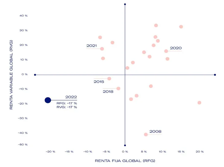 2 Fuente: Refinitiv Eikon. Basado en el MSCI All-Country World (Renta Variable Global o RVG) y Bloomberg Barclays Global Aggregate Bond (Renta Fija Global o RFG). Datos de 2022 hasta 30/11/2022.