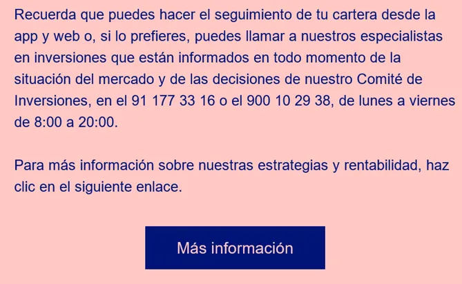 Las rentabilidades pasadas no garantizan rentabilidades futuras. Nada de lo aquí contenido constituye una representación o garantía en cuanto a rendimientos futuros. Toda inversión en los mercados financieros lleva un riesgo asociado que debe ser valorado antes de realizar cualquier inversión. Entre los riesgos, cabe mencionar, a título enunciativo, pero no limitativo, riesgo de mercado, de crédito, de emisor y contrapartida, de cambio, de moneda por fluctuaciones de valor e incluso la pérdida del capital invertido. En el caso de que la información relativa a un producto, activo, servicio de inversión o índice financiero se indique en una divisa diferente a la del inversor, se advierte que podrían producirse posibles incrementos o disminuciones del rendimiento en función de cualquier fluctuación en el tipo de cambio que pudiera producirse.