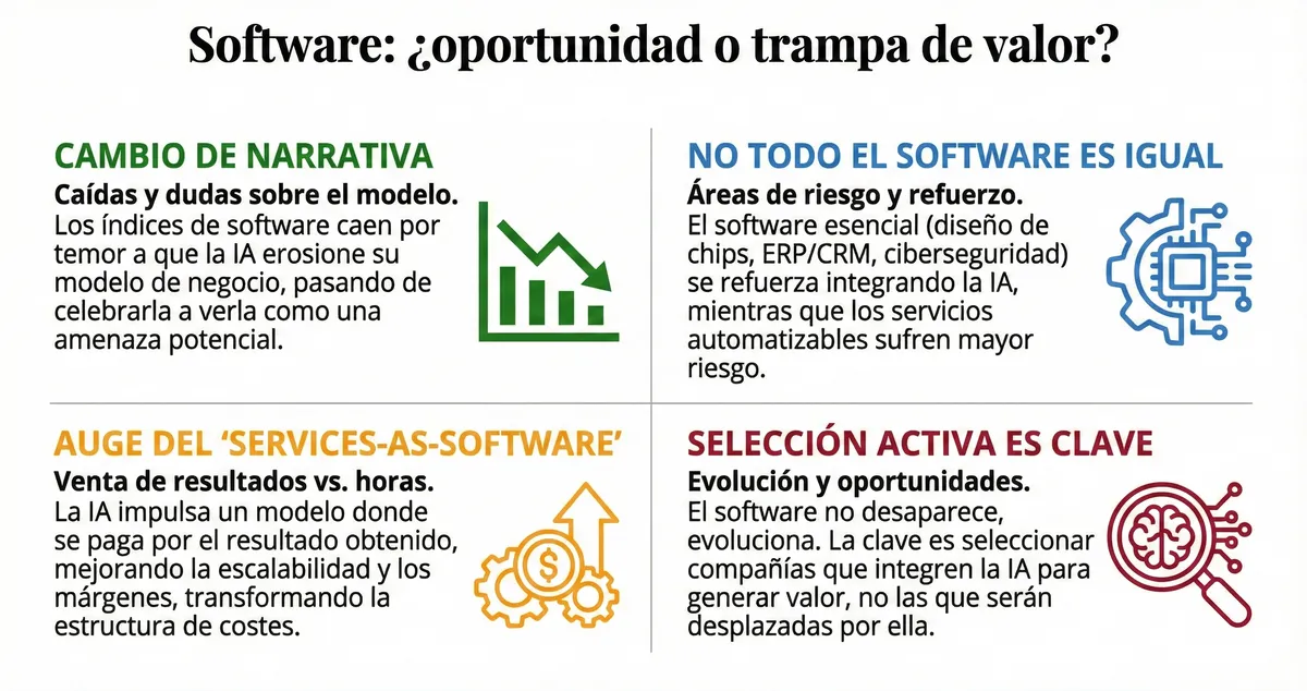 Este cambio de narrativa ha sido brusco. En cuestión de días, el sector perdió cerca de un billón de dólares en capitalización. Más que resultados, lo que se ha corregido es la percepción de futuro.