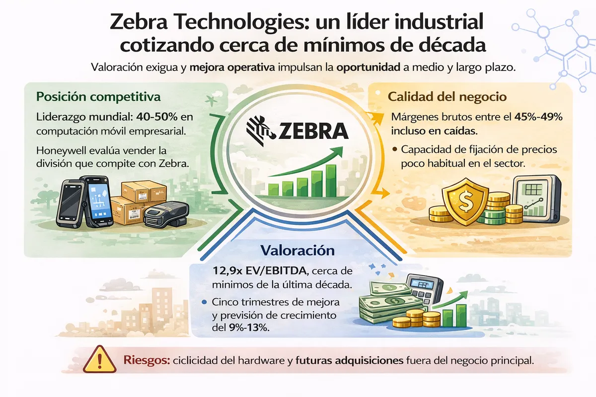 Hay compañías poco conocidas para el gran público que, sin embargo, están presentes en multitud de procesos cotidianos. Zebra Technologies es una de ellas. Cada vez que se escanea un producto en una caja, que un repartidor confirma una entrega en una tableta o que un hospital identifica a un paciente con una pulsera, es muy posible que la tecnología que hay detrás sea suya. La compañía cuenta con más de diez millones de dispositivos desplegados en cien países y presta servicio a empresas de más del 80% del Fortune 500. Pese a ello, la acción cotiza cerca de los niveles más bajos de la última década, una circunstancia que obliga a analizar si el mercado está infravalorando la calidad real del negocio.