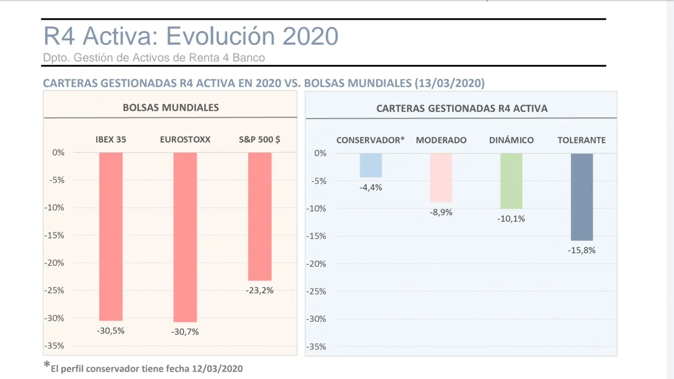 Es interesante comprobar que como efectivamente, aquellos inversores que hubieran optado por invertir en las carteras gestionadas por el equipo de gestion activa de Renta 4 estarían observando la situación desde una posición significativamente más cómoda. Así, las carteras de gestión activa de Renta 4 Banco están soportando mejor el impacto en los mercados mundiales. Tal y como se puede ver en el gráfico, a pesar de las caídas, nuestras carteras están sobrellevando mejor los vaivenes, minimizando el riesgo y limitando las pérdidas.