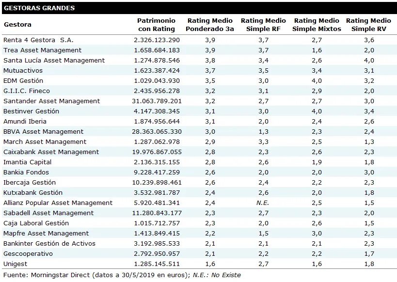 Como veis en la siguiente tabla, en agregado, en Renta 4 Gestora lideramos la categoría de Gestoras “Grandes" donde se incluyen aquellas SGIIC con más de 1.000 millones de euros de patrimonio en fondos calificados por Morningstar, como es nuestro caso. Además, por categorías: