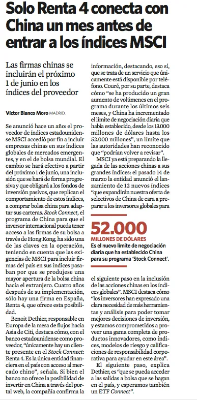 Renta 4 es la única entidad financiera en España con acceso al mercado chino, antes incluso de entrar a los índices MSCI. El Economista menciona a la compañía por ser la única en acercar a sus clientes las diferentes oportunidades del mercado.