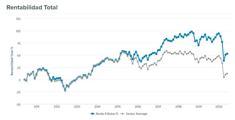El Renta 4 Bolsa ha obtenido una rentabilidad en los últimos 10 años de +52,8%, un 41% más que la rentabilidad media de fondos de renta variable española, según datos de Citywire.