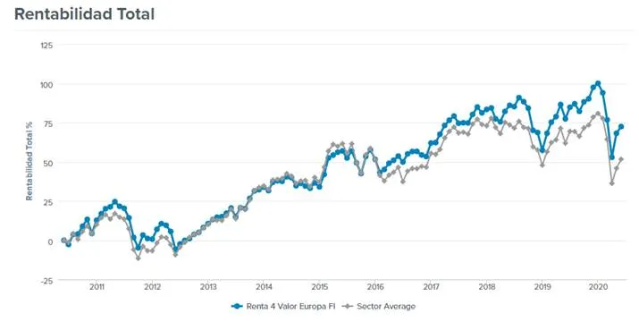 Según datos de Citywire, nuestro fondo Renta 4 Valor Europa ha obtenido una rentabilidad en los últimos 10 años de +72,4%, un 21% más que la rentabilidad media de fondos de renta variable europea.