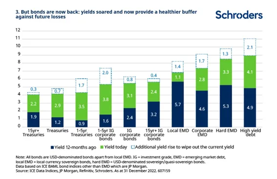 3. Pero los bonos están de vuelta: los rendimientos se dispararon y ahora proporcionan un colchón más sólido contra futuras caídas