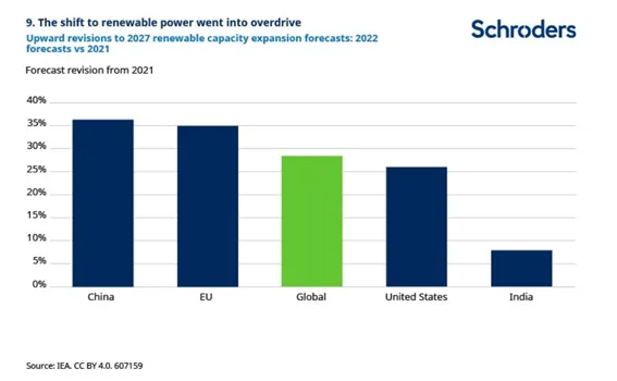 En comparación con lo previsto un año antes, se ha producido un aumento de casi el 30% en las previsiones de capacidad mundial de energías renovables para 2027. Esto supondría un aumento de casi el 75% de la capacidad mundial entre 2022 y 2027.. Ahora se espera que China alcance sus objetivos para 2030 en materia de energía eólica y solar en 2025. No hay que restar importancia a los retos de la aplicación, pero, impulsado por la necesidad, 2022 ha sido un año de transformación para los planes sobre el papel de las energías renovables en el suministro de seguridad energética.
