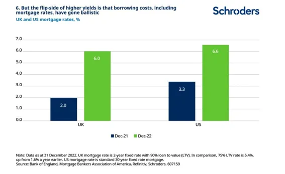 6. Pero la otra cara de la moneda del aumento de los rendimientos es que los costes de los préstamos, incluidos los tipos hipotecarios, se han disparado