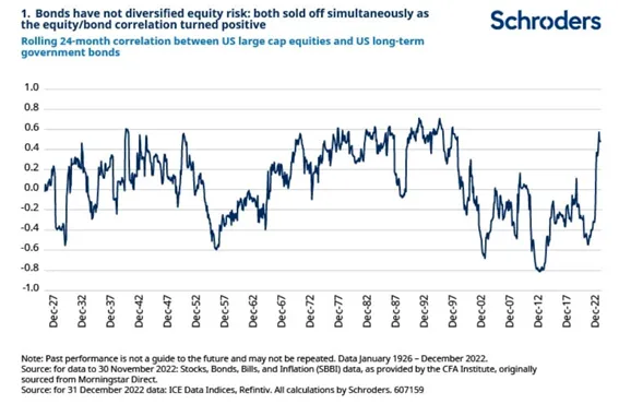 Desde finales de la década de 1990, la renta variable y la renta fija han estado correlacionadas negativamente, lo que significa que cuando una bajaba la otra subía y viceversa. Esto ha sido muy valioso para los inversores y ha constituido una guía en la construcción de muchas carteras. El cambio de régimen hacia un entorno de inflación más alto y volátil ha roto esta premisa.
