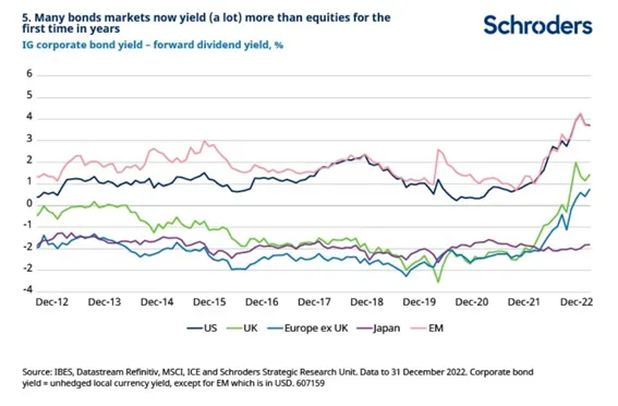 Muchos inversores de rentas han huido de la renta fija para optar por las acciones. Será interesante ver si esto se invierte ahora que los rendimientos de los bonos corporativos superan ampliamente la rentabilidad de los dividendos en muchos mercados.