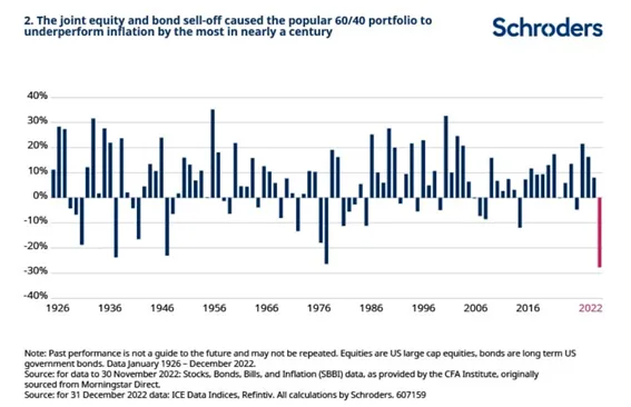 2. La venta conjunta de renta variable y renta fija ha provocado la mayor pérdida de rentabilidad de la cartera 60/40 frente a la inflación en casi un siglo