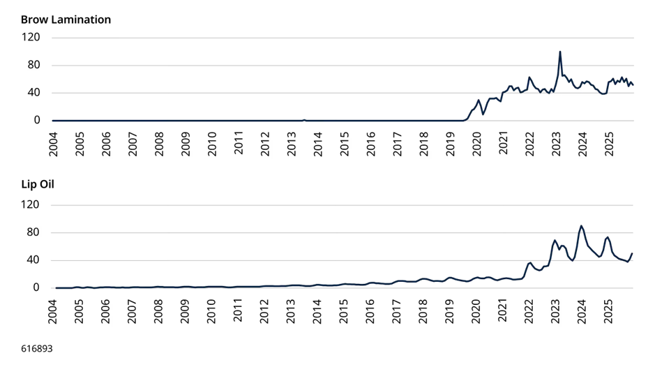 El auge de las redes sociales y la proliferación de marcas más pequeñas y ágiles han acelerado drásticamente los ciclos de las tendencias. Los nuevos productos y las microtendencias pueden ganar rápidamente popularidad en Internet. El entusiasmo que generan tiende a alcanzar su punto álgido y a desvanecerse rápidamente. Los datos de búsqueda de Google en Estados Unidos ilustran lo efímeras que se han vuelto muchas de las tendencias de belleza recientes.