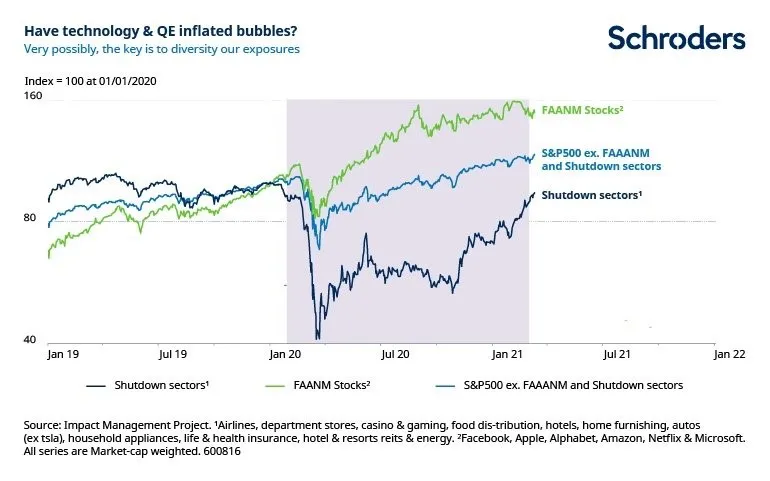 Creemos que podríamos estar ante una burbuja, pero está localizada en los valores tecnológicos de segundo nivel que cotizan a valoraciones elevadas y cuyas proyecciones de ingresos son demasiado ambiciosas. Si excluimos la tecnología y los valores más afectados por los cierres económicos mundiales, según el gráfico siguiente, podemos ver que las valoraciones (representadas por la línea verde central) no son excesivas. Si observamos los sectores que lo hicieron mal el año pasado a causa de la pandemia y que no participaron en el rally que hemos visto desde noviembre de 2020 (es decir, los "sectores del confinamiento", línea azul oscura en la parte inferior), las valoraciones siguen siendo muy aceptables.Una forma de capear una burbuja, es diversificar tu exposición.