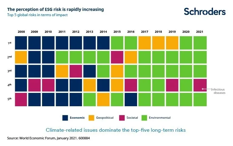 Como inversores, tendremos que abordar cuestiones importantes como la gestión de los grupos de interés y la forma de fomentar la transición hacia una economía baja en carbono. El siguiente gráfico muestra cómo la gente de todo el mundo es cada vez más consciente de los riesgos ASG. Procede del Foro Económico Mundial y muestra cómo, desde la crisis financiera de hace unos 14 años, los cinco principales riesgos a largo plazo a los que se enfrenta la sociedad han pasado de ser de naturaleza económica a ser casi exclusivamente medioambientales.