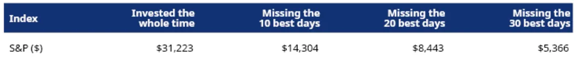 Pero el resultado habría sido muy diferente si hubieras tratado de programar tu entrada y salida del mercado. Durante el mismo periodo, si te hubieras perdido los 30 mejores días del índice S&P500, la misma inversión podría valer ahora 5.366 dólares, es decir, 25.857 dólares menos, sin tener en cuenta el efecto de los gastos o la inflación.
