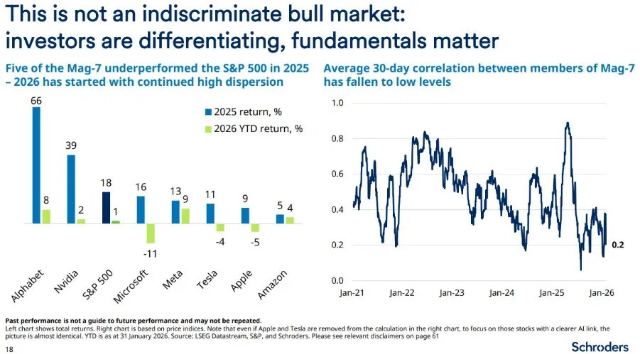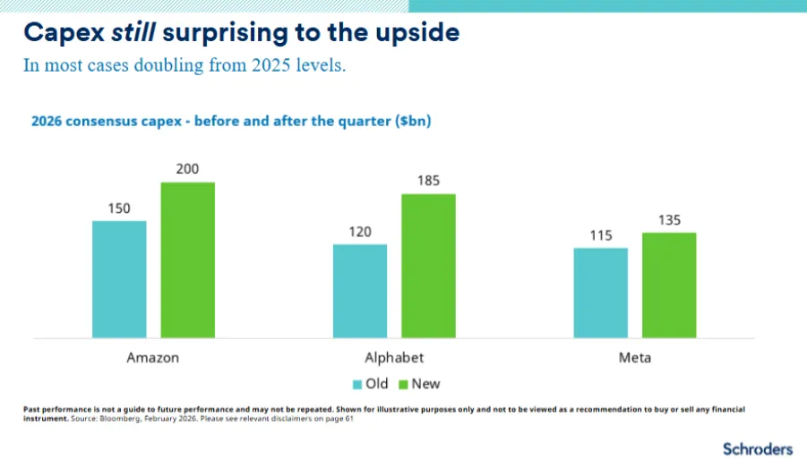 En este entorno expansivo, la baja correlación y la alta dispersión de la rentabilidad entre las megacapitalizaciones es una señal saludable de que los inversores están diferenciando. Y de que los fundamentales importan (ver primer gráfico). Todo ello en un momento en el que el gasto en capital (capex) de las grandes compañías tecnológicas para 2026 se prevé elevado, como mostramos en el segundo gráfico.