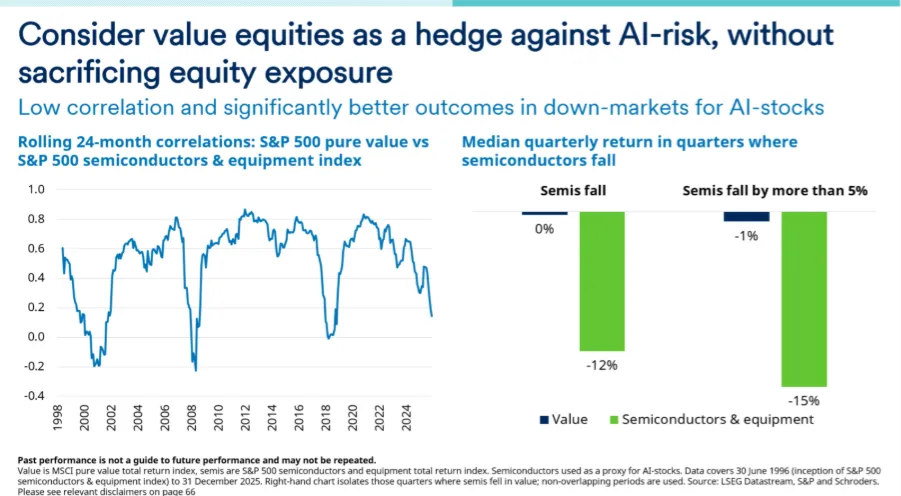 Muchos inversores están preocupados por el riesgo de la IA, uno de los grandes focos de atención bursátil en el actual ciclo de mercado. Con todo, no quieren sacrificar la exposición a la renta variable, para lo cual deberían considerar las acciones de valor (value). Este estilo de inversión (value) tiene una baja correlación con las acciones relacionadas con la IA. Las acciones value han obtenido resultados significativamente mejores en los mercados bajistas para las acciones de IA (ver el gráfico a continuación).