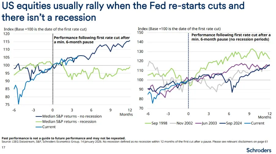 Las valoraciones pueden ser elevadas en estos momentos, pero las acciones estadounidenses suelen repuntar después de que la Reserva Federal recorte tipos y no haya recesión, como es el caso actual.