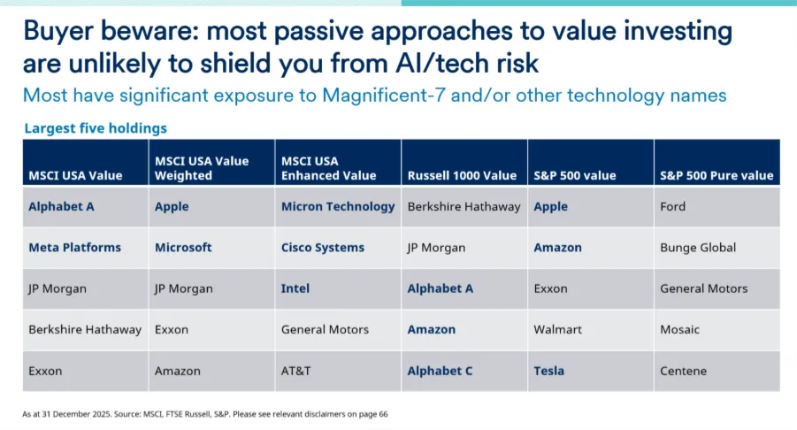 En este contexto es importante tener en cuenta que es poco probable que la mayoría de los enfoques pasivos de inversión acciones value protejan del riesgo de la IA/tecnología. La mayoría tienen una exposición significativa a los Siete Magníficos y/u otras empresas tecnológicas. Para gestionar esto adecuadamente, se necesita un enfoque de inversión activo (ver último gráfico, debajo).