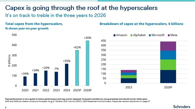 El gasto de capital se está disparando en los hiperescaladores (grandes proveedores de servicios en la nube que operan centros de datos masivos y globales). Además, este gasto va camino de triplicarse en el trienio 2024 a 2026.