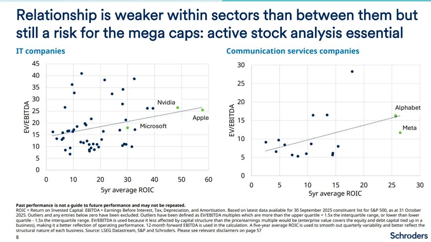 La relación es más débil dentro de los propios sectores que entre ellos, pero sigue siendo un riesgo para las empresas de megacapitalización: es esencial un análisis activo a nivel individual de cada acción a la hora de invertir.