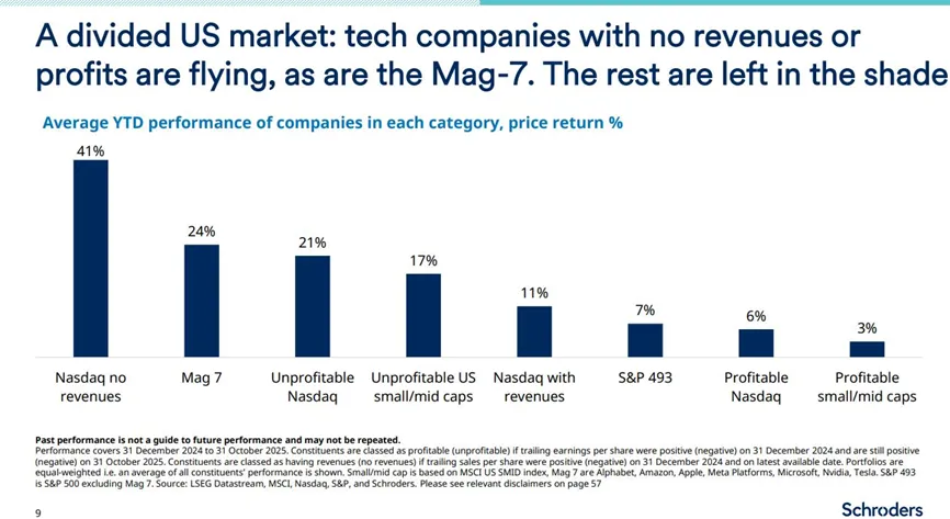 El mercado estadounidense pone de manifiesto una divergencia en la propensión al riesgo: las empresas tecnológicas sin ingresos ni beneficios están en auge, al igual que los motores del crecimiento de los beneficios en Estados Unidos: los Siete Magníficos. El resto se está quedando en la sombra. Así, se está acentuando la división, como muestra el siguiente gráfico: