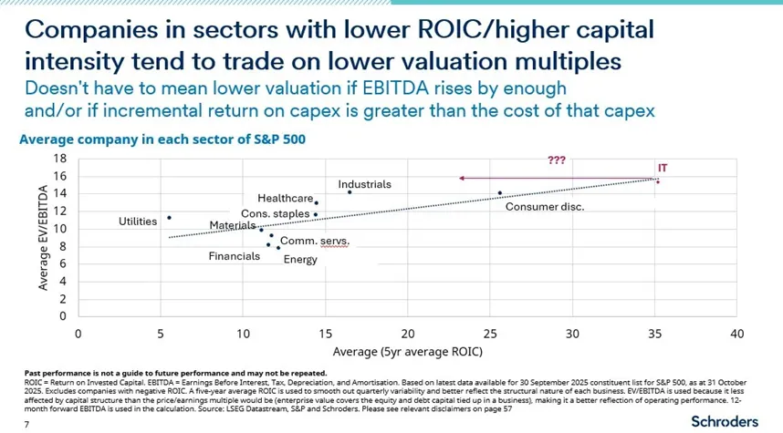 El cambio hacia una mayor intensidad de capital en la operativa de las grandes compañías tecnológicas presenta un riesgo que se refleja en su situación bursátil: las empresas de sectores con mayor intensidad de capital/menor ROIC tienden a cotizar con múltiplos de valoración más bajos. Esto no tiene por qué significar una valoración más baja si el EBITDA aumenta lo suficiente y/o si la rentabilidad incremental de la inversión en capital es mayor que el coste de dicha inversión (véase el siguiente gráfico).