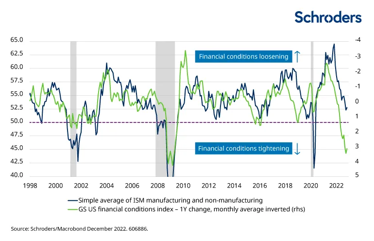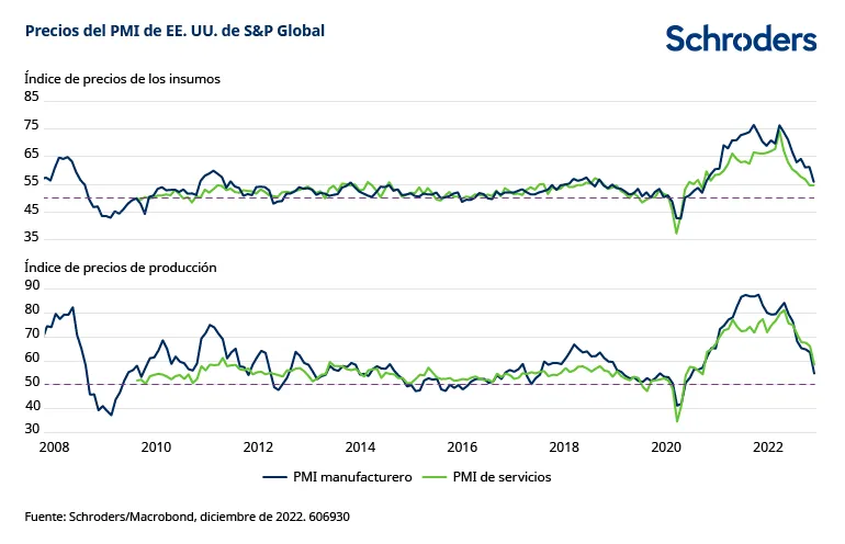 El aumento de la inflación complicó las perspectivas de los bonos en 2022, pero hay signos alentadores de cara a 2023. La inflación de los bienes ha sido el principal indicador del aumento de la inflación en los últimos 18 meses, y estamos empezando a ver pruebas más claras de que esto se está invirtiendo - el llamado efecto "látigo" que hemos estado esperando. Aunque indicadores como los costes mundiales de transporte y las encuestas ISM/PMI llevan tiempo apuntando a esta dinámica (gráfico 1), ahora por fin empezamos a verla reflejada en los datos oficiales de inflación (gráfico 2), y creemos que esto puede seguir así de cara a 2023.