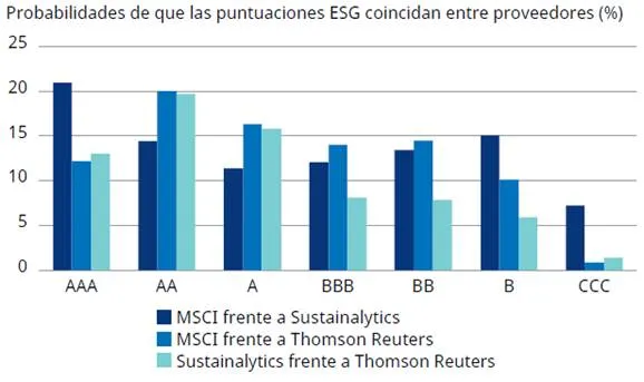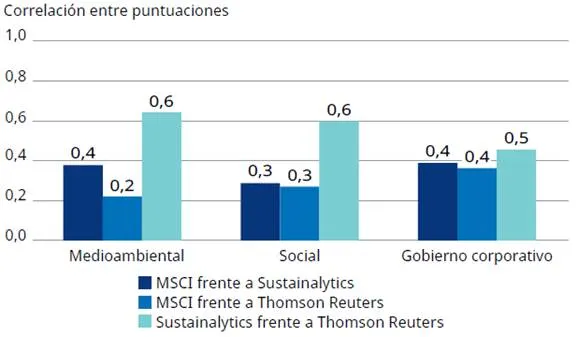 Al analizar el grado de coincidencia de las puntuaciones ASG, vemos que existe una falta de coherencia entre los principales proveedores de datos: MSCI, Sustainalytics y Thomson Reuters. Así, cada proveedor tiene una definición diferente de lo que significa un buen desempeño ASG.