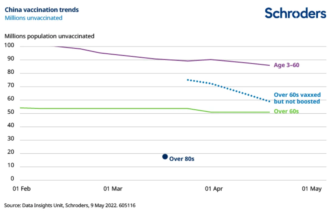 En primer lugar, un punto clave a destacar es que la eficacia de las vacunas producidas en China no es el problema. El problema de China es que gran parte de la población de edad avanzada sigue sin estar vacunada, o lo está de forma insuficiente. De hecho, hay alrededor de 17,5 millones de personas mayores de 80 años sin vacunar. El siguiente gráfico muestra que el ritmo de vacunación entre los mayores de 60 años ha sido muy lento. De acuerdo con las tendencias actuales, la vacunación del 95% de la población mayor de 60 años no se producirá este año, y potencialmente tampoco hasta 2024.
