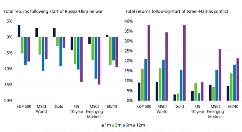 Fuente: Schroders, Refinitiv Datastream, 26 de enero de 2026. La guerra Rusia-Ucrania empezó el 24 de febrero de 2022, y el conflicto de Israel-Hamás, el 23 de octubre de 2023.