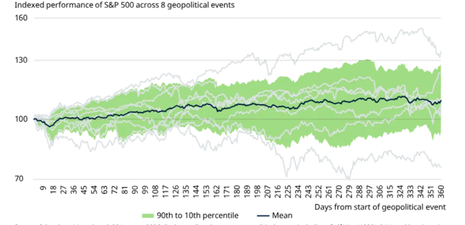 Fuentes: Schroders, Macrobond, 22 de enero de 2026. Cada línea gris indica un acontecimiento geopolítico, incluyendo: Guerra del Golfo (1990), 11-S y la Invasión de Irak (2001), atentados en Madrid y ataques en Moscú (2022$), Crimea e ISIS (2014), tensiones EE.UU.-Corea del Norte (2017), Guerra de Ucrania-Rusia (2022), Conflicto Israel-Hamás (2023), Israel-Irán (2025).