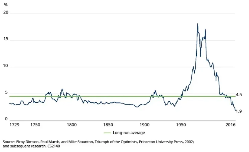 Estos beneficios de doble dígito se han quedado grabadas en nuestras mentes. Sin embargo, no hay que olvidar que fueron la excepción, no la regla. A lo largo de la historia, la rentabilidad de los bonos se han mantenido más cerca de donde estamos hoy, tal y como muestra el siguiente gráfico. Como consecuencia, los beneficios de los inversores también fueron más limitados.