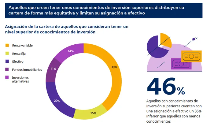 9) Los asiáticos, los que asignan un nivel más alto de efectivo. Si hablamos de datos globales, los inversores asiáticos, independientemente de sus conocimientos de inversión, invierten un 29% de sus carteras en estos activos. Por el contrario, los inversores en América son los que tienen menos exposición: asignan una media del 20% de sus inversiones a efectivo.