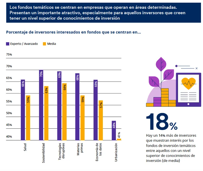 10) Tecnología, sostenibilidad, salud y materias primas: las favoritas de los inversores. Estas temáticas son las que más interesan a los inversores. Los Millennials españoles y los inversores avanzados o expertos muestran especial interés por la sostenibilidad como temática de inversión, respectivamente. Para los españoles mayores de 37 la temática más importante son las tecnologías disruptivas.