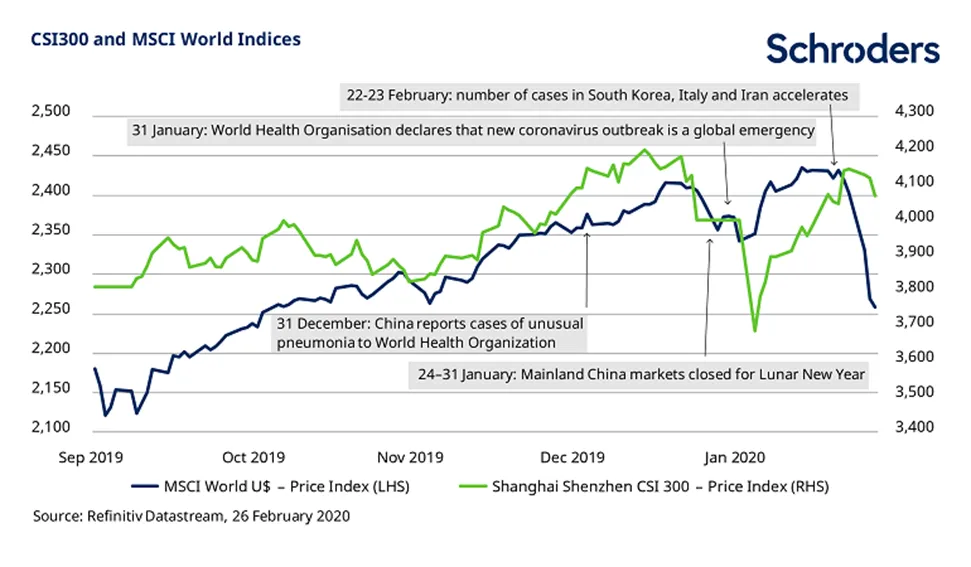 La propagación del coronavirus, COVID-19, más allá de China ha generado incertidumbre para las perspectivas de crecimiento mundial provocando volatilidad en los mercados financieros. Los brotes en España, Italia, Corea del Sur e Irán, entre otros países, han suscitado la preocupación de que la propagación fuera de China podría estar acelerándose. Pero ¿cómo afecta todo esto a las inversiones? Lo analizamos a continuación a través de siete gráficos:
