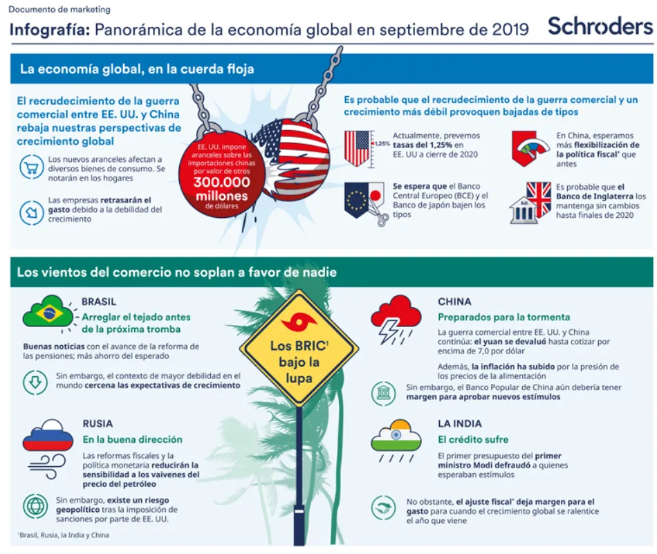 La escalada de la guerra comercial no ofrece muchas posibilidades de mejorar las perspectivas de los mercados emergentes. Reducimos las expectativas de crecimiento de las economías BRIC este trimestre y esperamos que la guerra comercial la debilidad de 2020. En un tono más positivo, creemos que ahora hay margen para una mayor relajación cuantitativa por parte de los bancos centrales de los países emergentes, mientras sus homólogos desarrollados adoptan una postura más dovish.