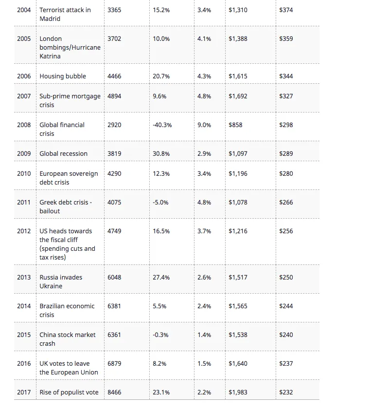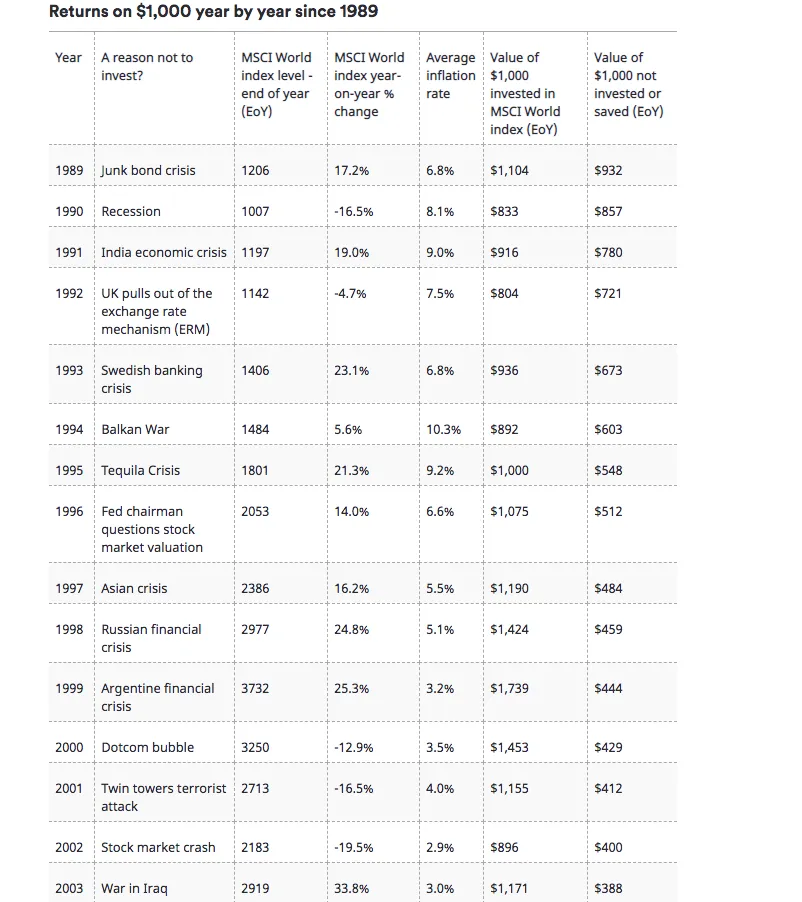 La siguiente tabla ilustra cómo el rendimiento de sus inversiones podría haber aumentado año tras año entre 1989 y 2017. Demuestra el efecto perjudicial que la inflación puede tener en su patrimonio si no pone su dinero a trabajar. También muestra las excusas que los inversores podrían haber usado para no invertir en alguno de los años señalados desde una perspectiva global.